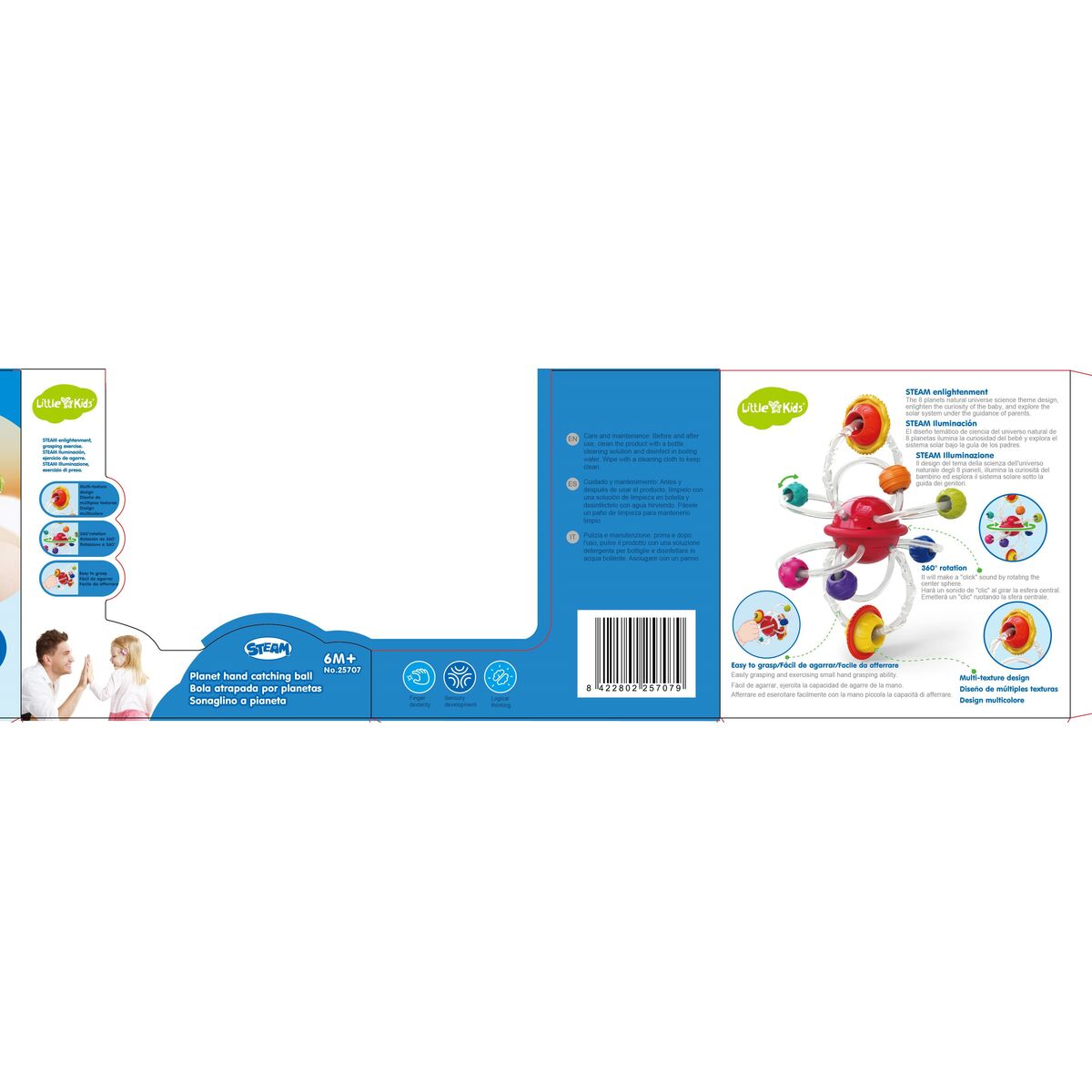 The BigBuy Fun Teething Rattle is a product specially designed for babies from 6 months old, combining entertainment and comfort during the teething stage. This teether features a planetary ball that includes several teething rings, offering a multi-sensory experience that helps soothe the discomfort of emerging first teeth. Made of soft, child-safe polyester, it ensures a pleasant touch and durability for everyday use. It is a multicultural product originating from Spain and Switzerland, reflecting strict quality control and high manufacturing standards. The multicolor design promotes visual stimulation and is attractive to the little one, while also encouraging motor coordination when handling the rattle. Measuring approximately 17x16x9 cm, it is lightweight and easy for baby hands to hold, facilitating use and supporting fine motor skill development. This teething rattle is a practical and functional solution that meets both comfort and entertainment needs in early childhood development, maintaining a design adapted to current safety and quality standards for the youngest. In short, it is a product designed to accompany and ease the natural dental growth process with suitable and appealing materials for babies.